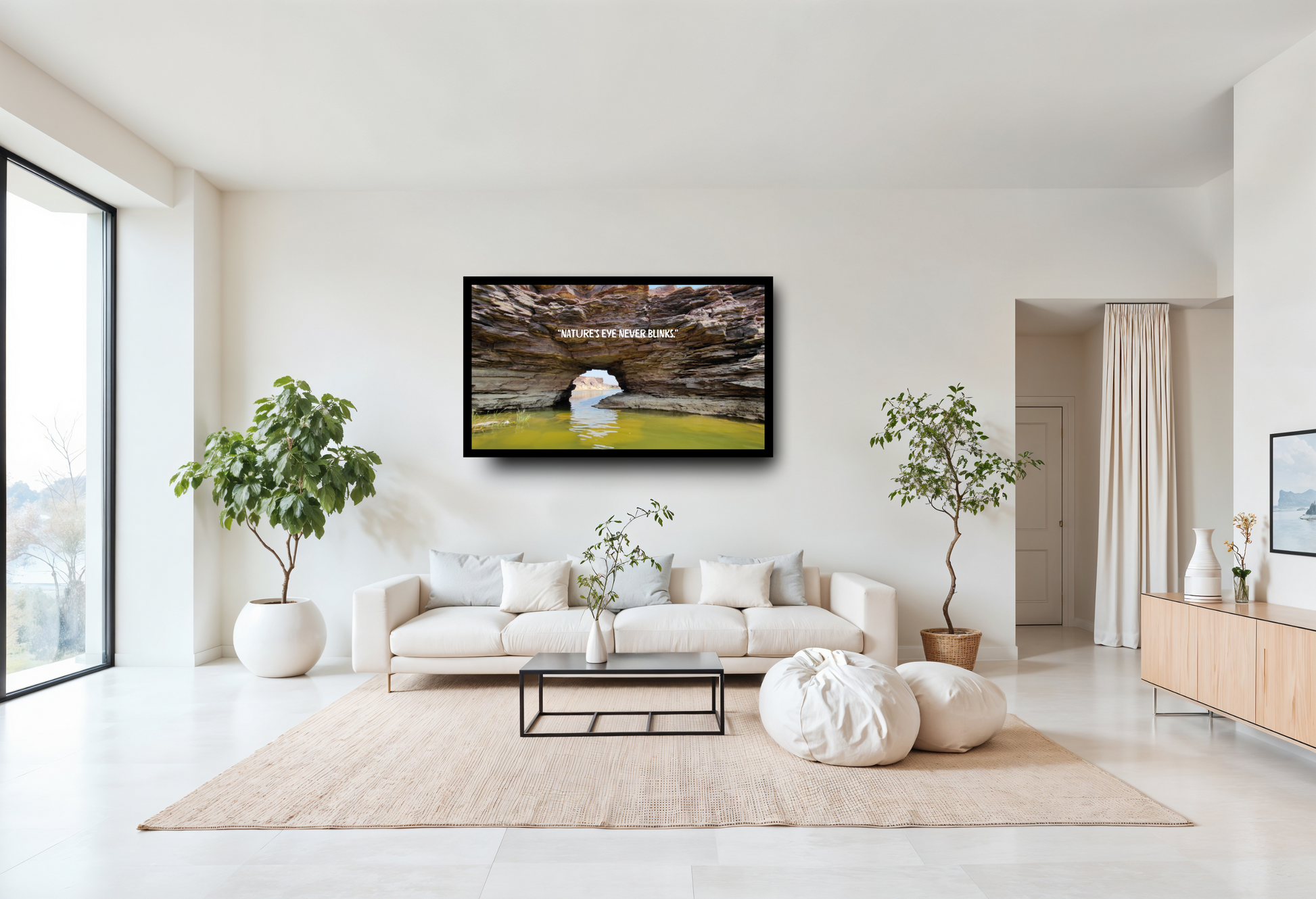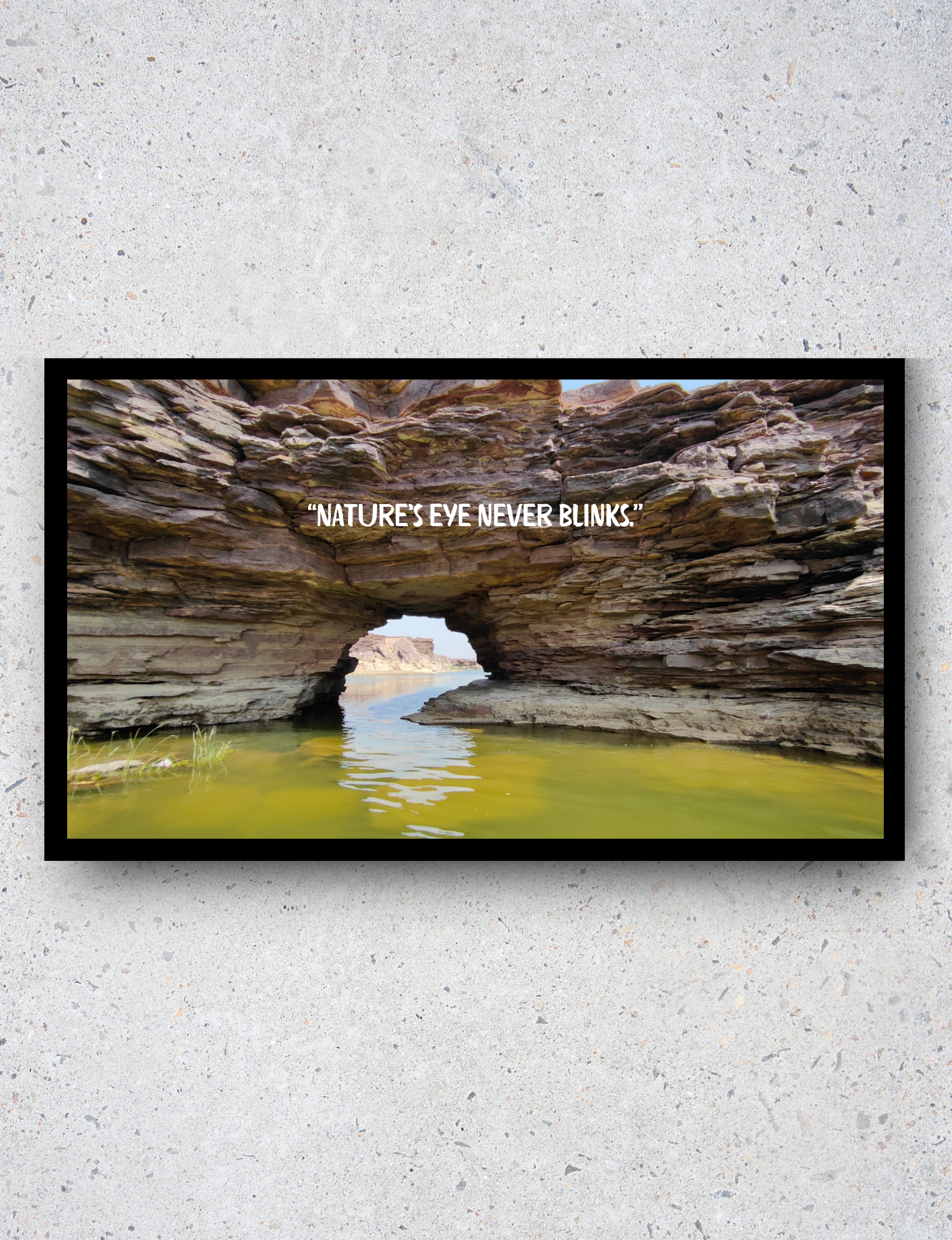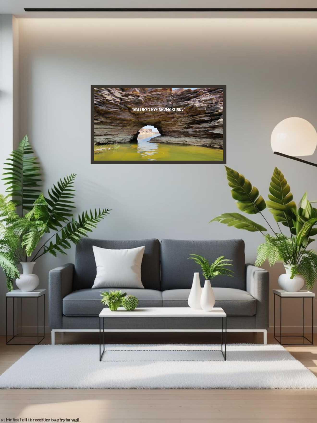 Bring the beauty of nature into your space with this stunning wall art print titled "Nature’s Eye Never Blinks." Featuring a breathtaking rock formation resembling an eye over tranquil green waters, this landscape photography adds a calming and inspiring touch to any room.